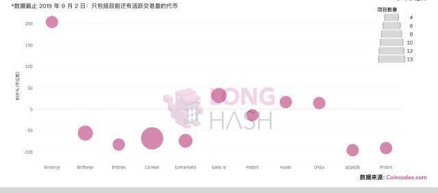 其中成績最好的顯然是幣安,其四個項目的投資回報率中位數為203%。Gate.io,火幣和OKEx都呈現了正投資回報率。另一方面,probit和p2pb2b的投資回報率中位數均低于-90%—對那些在這段時期內在這些項目里投入了100美元的投資者而言,能夠拿到10美元離場已經算是幸運的了。