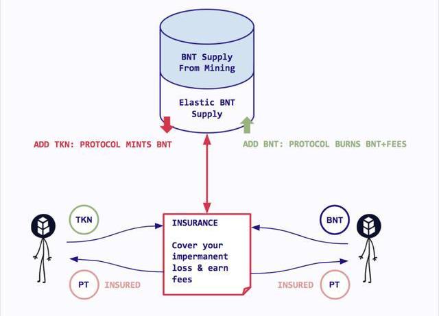 最關鍵的是,彈性的BNT供應為協議無常損失保險創造了可能性。償還流動性時,可以通過用BNT補償流動性提供者在資金池中經歷的任何無常損失,從而實現流動性的覆蓋。與單方面流動性提供者類似,Uniswap或SushiSwap等競爭對手無法提供這種功能。用于此目的的BNT首先來自協議獲得的交易費用(來自共同投資的BNT),并且僅在費用準備金不足時才會作為一種措施鑄造。
