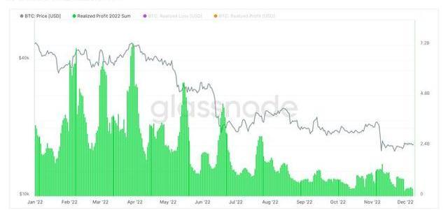 隨著隨后幾個月價格的下跌,賣出的投資者的利潤也減少了。2022年實現的最低收益是2022年12月記錄的5億美元,當時BTC的交易價格大多低于17,000美元。