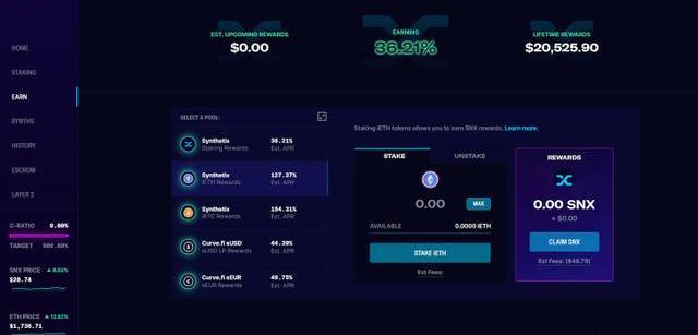 一旦您收到iETH,您的組合頭寸應該是市場中立的。如果ETH上漲1美元,那么您在PerpetualProtocol做多的利潤為1美元,這抵消了Synthetix上iETH的1美元損失。作為最后一步,您需要到Synthetix的收益頁面以抵押您的iETH代幣,為此您將在SNX中獲得獎勵。目前,iETH抵押的年度利率超過100%。