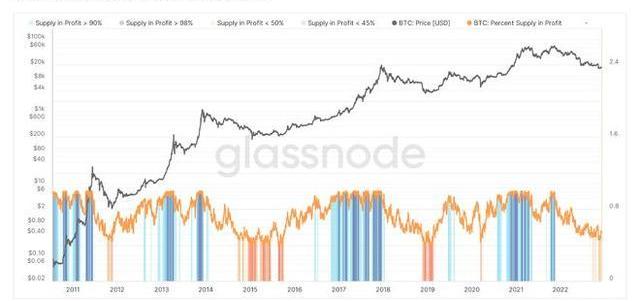 另一個標志著熊市結束的指標是供應占利潤的百分比。利潤中的供應百分比顯示了在上次價格走勢期間以低于當前價格的價格購買的可用BTC的百分比。