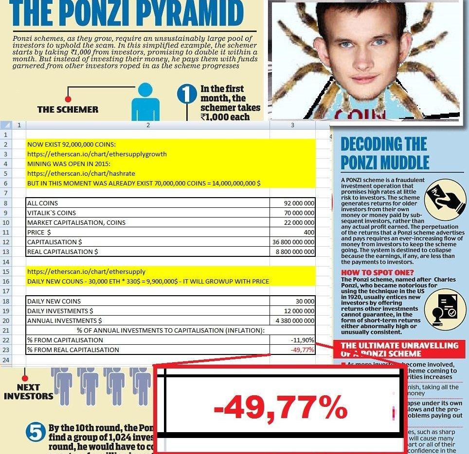 以太坊是加密領域首次代幣發行(ICO)的早期例子,也是最成功的例子之一,自2015年以來漲幅超過778,000%。一位用戶引用了2017年ICO熱潮期間經常出現的一個瘋狂觀點“蜘蛛Vitalik龐氏騙局”,并將Vitalik描述為負責以太坊龐氏騙局網絡的蜘蛛。