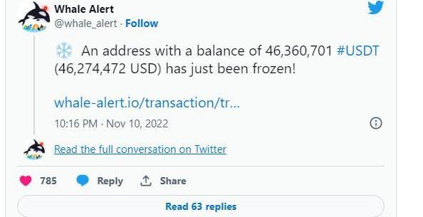 這種可怕的活動立即導致了與USDT掛鉤的失衡:該資產跌至0.98美元以下,這是自5月UST崩盤以來的最低水平。相比之下,USDC“飆升”至1,007美元。這種不平衡釋放了危險的套利機會。然后,USDT的運營商TetherLimited以超過4600萬美元的最大穩定幣封鎖了FTX支持的地址。此限制已通過自動跟蹤服務注冊。
