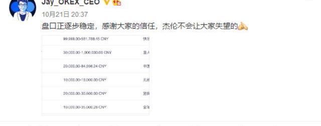 OKExCEOJAYHAO通過微博發文:“盤口正逐步穩定,感謝大家的信任,杰倫不會讓大家失望的”。