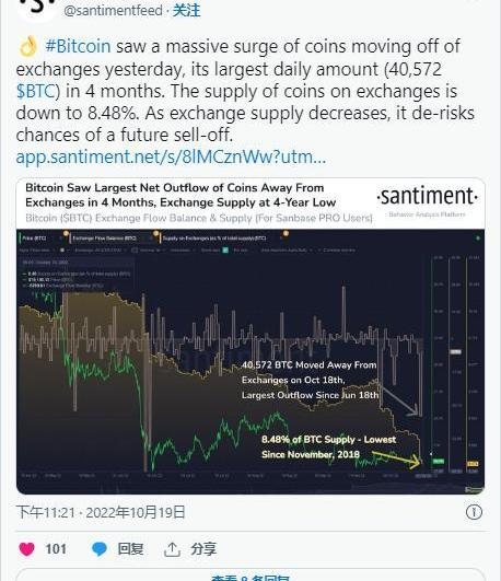 Santiment也證實,“隨著交易所供應量的減少,它降低了未來拋售的風險。”