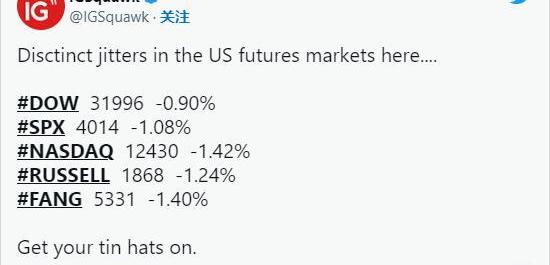 下跌之際,金融分析師和評論員預測周一股市將出現艱難局面。交易平臺提供商IGGroup在Twitter上報告了明顯的“期貨市場的緊張情緒”,建議投資者“戴上帽子”。