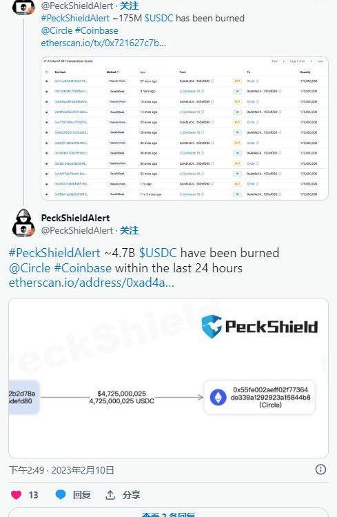 而據PeckShieldAlert稍早數據顯示,過去24小時內,Coinbase共計已將47.25億枚USDC發往Circle進行分批銷毀、每次銷毀1.75億枚。根據官方說明,每次燒毀就代表有等值USDC出金換成法幣。