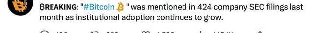但是,有跡象表明這種情況可能很快就會改變。有消息稱,上個月有424家公司提交給SEC的文件中提到了比特幣。這意味著要么公司已經開始購買,要么正在考慮在不久的將來購買。這是我們未來需要關注的事情。