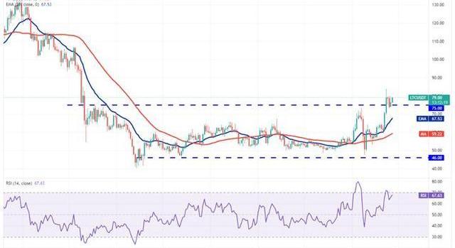 萊特幣的突破上方阻力位75美元是潛在趨勢變化的第一個跡象。空頭試圖將價格拉回75美元以下并困住好斗的多頭,但買家堅守陣地。