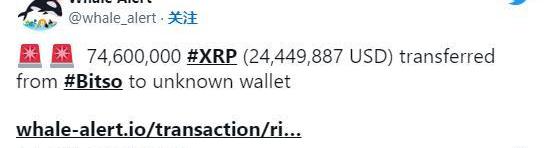 7460萬個XRP代幣,在交易時價值約2445萬美元,從Bitso交易所發送到一個未知的錢包。