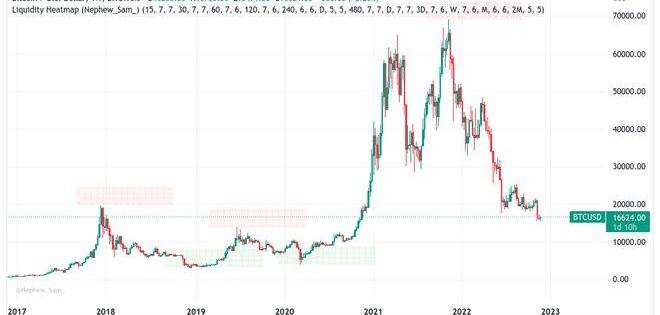 帶有流動性熱圖數據的BTC/USD1周蠟燭圖(Bitstamp)