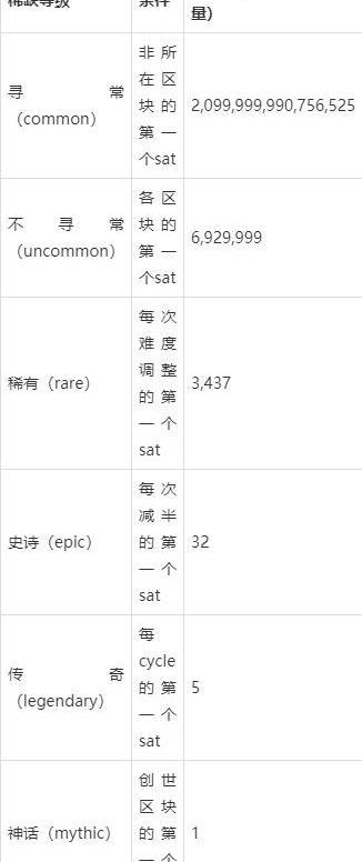 Ordinals使用這些事件來創建一個跟蹤sat相對稀缺性的進程。《序數理論手冊》使用下面的稀缺分級詳細分解了sat與這些事件的關系:
