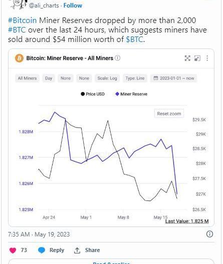 根據流行的加密貨幣分析師AliMartinez的說法,比特幣礦工的儲備在過去24小時內減少了2,000多個BTC,這表明礦工-幫助保護區塊鏈并獲得區塊獎勵作為回報-已經拋售了價值5500萬美元的比特幣市場。