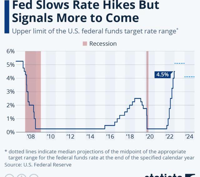 3月16日,美聯儲FOMC宣布加息25基點,為2018年來首次。此后更是一路狂飆,連續4次大幅加息75基點,年內共加息7次,累計加息425基點,將聯邦基金利率的從年初的0%上調到4.25%至4.50%,創下了1980年以來最大年度加息幅度。