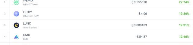 今天漲幅最大的是WEMIX代幣、以太坊PoW和TerraClassic
