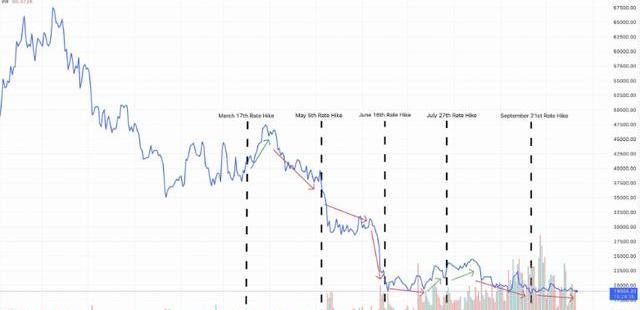 但隨著通脹數據持續居高不下,美聯儲的加息變得更加激進,連續三次加息75個基點。這最后三次加息尤其震撼了加密貨幣和股票市場,導致價格大幅下跌。