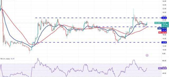 多頭成功守住了22.30美元的支撐位。這表明買家的需求強勁。8月8日,價格在23.71美元處突破20日均線,發出了重要的反轉信號。20日均線持平,且RSI處于正值區域,表明多頭略有優勢。SOL/USDT貨幣對可能反彈至25.68美元,然后反彈至27.12美元,這是強勁的阻力位。