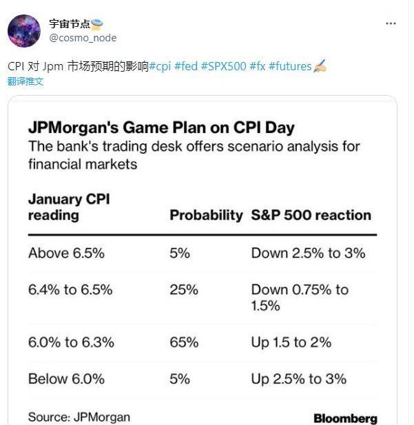 摩根大通對標準普爾500指數的游戲計劃如下:基本情況認為1月CPI介于6.0%和6.3%之間,這可能觸發1.5標準普爾500指數上漲%至2%。