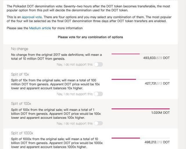 同意DOT拆分100倍的投票占比最高,具體票數為1,020,000DOT;