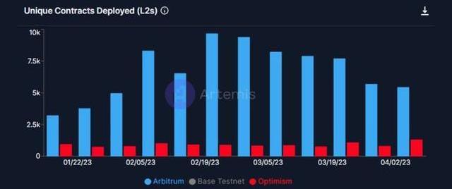 我要監控的最后一個指標是鏈上開發,對我來說它表示正在產生的價值量。平均而言,$ARB部署了超過6,000個合約,而$OP只有大約1,000個