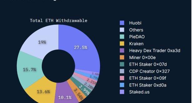 根據鏈上分析工具,Huobi排名第一,有27.5%的實體等待解除其抵押的ETH,其次是其他實體
