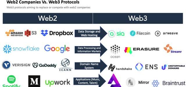 Messari的這張圖表顯示了功能如何從一些當前集中的平臺遷移到基于區塊鏈構建的更分散的版本: