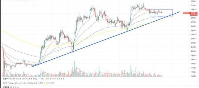 2.BTC上方壓力位是比較明確的3萬一帶,下方有非常重要的支撐位在上升趨勢線以及EMA120重合的位置,大致在28400一帶