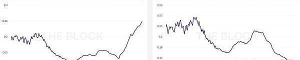 以太坊在過去兩天出現的劇烈價格波動可歸因于市場參與者在衍生品市場進行的投機交易。如下圖所示,ETH的現貨:期貨交易量最近一直在下降,這表明與投資者相比,交易者現在一直在發號施令。