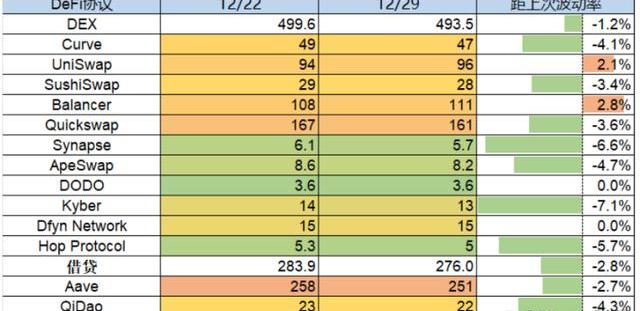 本周整體TVL變化較小,依舊維持向下趨勢,本周下降0.86B,下降幅度為2.16%,下降幅度略低于BTC和ETH下跌幅度,呈現小幣種持倉向主流轉移,小幣種跌幅更大的趨勢。