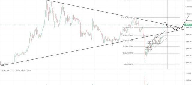 若按照日線大三角的思路來走,減半前有可能拉升到9600附近,甚至假突破三角上軌引發市場FOMO情緒,再回落到下軌支撐完成一波收割,減半后繼續在三角末端震蕩盤整,然后向上突破。