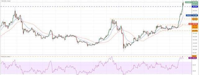 兩個移動均線均在上升,RSI處于超買區域,這表明多頭處于主導地位。
