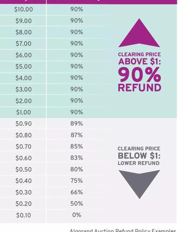 荷蘭拍:Algo采用荷蘭拍的模式進行公募,每次公募售出2500萬個幣,大約一個月兩次,一年釋放量6個億,5年釋放完公募的額度30億。和傳統荷蘭拍形式不同,Algo在區塊鏈上公開競拍,從高往低處競價,競拍滿額則以最低價成交,第一次競價以10美元開始,最后以2.4美元的價格成交。