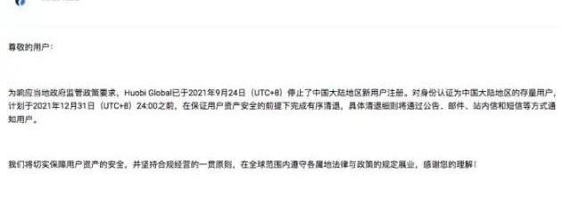 9月24日顯卡礦機管理軟件NBMINER宣布,不再對中國大陸用戶提供技術支持服務并解散QQ群。9月24日,BiONE宣布將于2021年9月29日24:00(UTC+8)進行永久停機維護,用戶務必于2021年9月29日前將持有幣種提至其他交易所或錢包,逾期未提幣造成無法提幣平臺概不負責。9月24日,富途牛牛App顯示,應香港證監會監管要求,以下代碼:GBTC、EHTE、ETCG、GDLC、OBTC、LTCN、BCHG將于2021年10月1日起,禁止新開倉交易,原有持倉平倉不受影響。9月25日,TokenPocket表示,將對中國內陸用戶終止相關部分功能服務、終止對可能涉及交易相關的及不符合《通知》等規范性文件或法律、法規規定的第三方DApp等的服務,保留錢包的基礎服務功能。9月25日,BHEX公告,為響應全球各地監管要求,符合各地加密貨幣法律法規的營運要求,BHEX全球站即日起永久關閉平臺服務。2021年10月23日平臺關閉,平臺關閉后,所有人無法再登錄平臺網站和App。9月26日,LoopringTechnologyLimited決定停止為中國用戶提供所有與虛擬貨幣交易相關的產品和服務。具體包括:不再支持中國用戶下單交易;不再支持中國用戶通過路印錢包使用與交易相關的第三方應用。依托于路印的zkRollup擴容技術,用戶依然可以隨時提現。我們會在以上措施落地實施后第一時間發布新的公告。9月26日,幣安暫停了中國大陸地區新用戶的注冊。9月26日,ZKSWAP決定停止為中國IP用戶提供所有與虛擬貨幣交易及其相關產品和服務。具體包括:不再支持中國IP用戶訪問網站和App,不再支持中國IP用戶進行Swap等產品服務。9月26日,HyperDAO基金會宣布,將不再在中國的社交媒體上交流討論和虛擬貨幣相關的話題,停止并退出所有中國大陸的業務。9月26日,火幣發布公告稱,9月24日停止了中國大陸地區新用戶注冊。對身份認證為中國大陸地區的存量用戶,計劃于2021年12月31日24:00之前,在保證用戶資產安全的前提下完成有序清退,具體清退細則將通過公告、郵件、站內信和短信等方式通知用戶。
