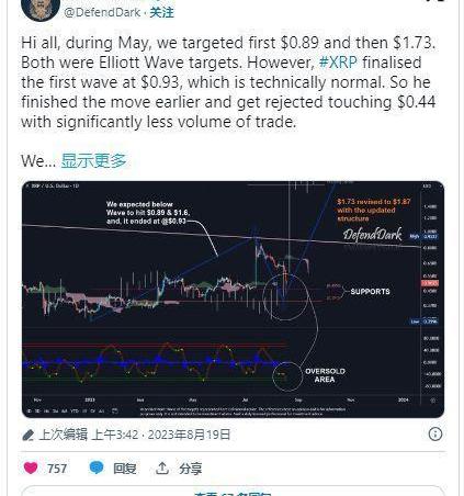 DarkDefender引用歷史模式和XRP的價格動態,預測其價格將上漲至0.89美元,然后最終價格達到1.73美元。當時,XRP在0.44美元至0.50美元的價格范圍內波動。