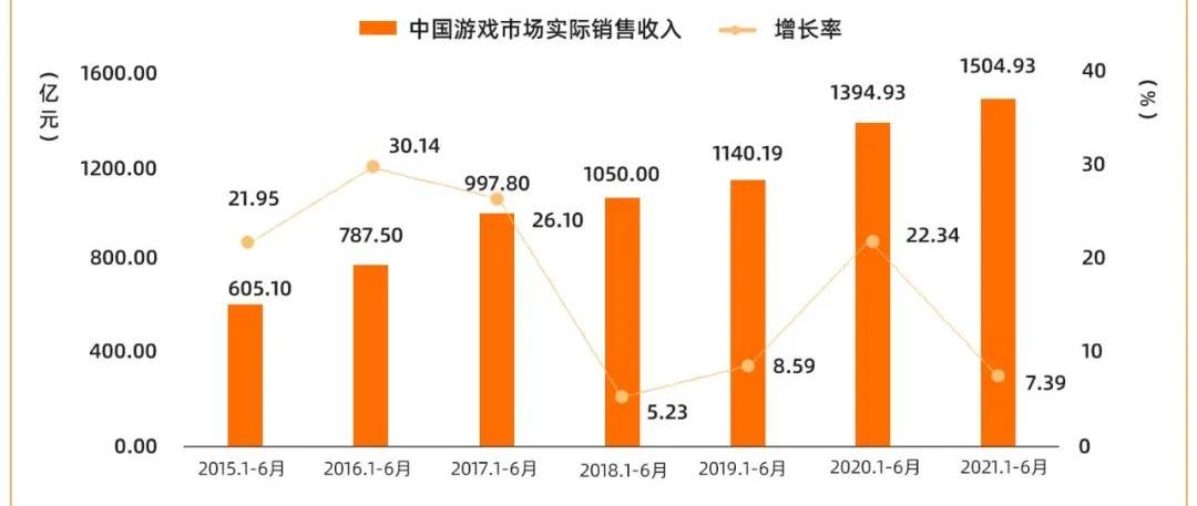 ·2021年1-6月中國游戲市場實際銷售收入及增長·