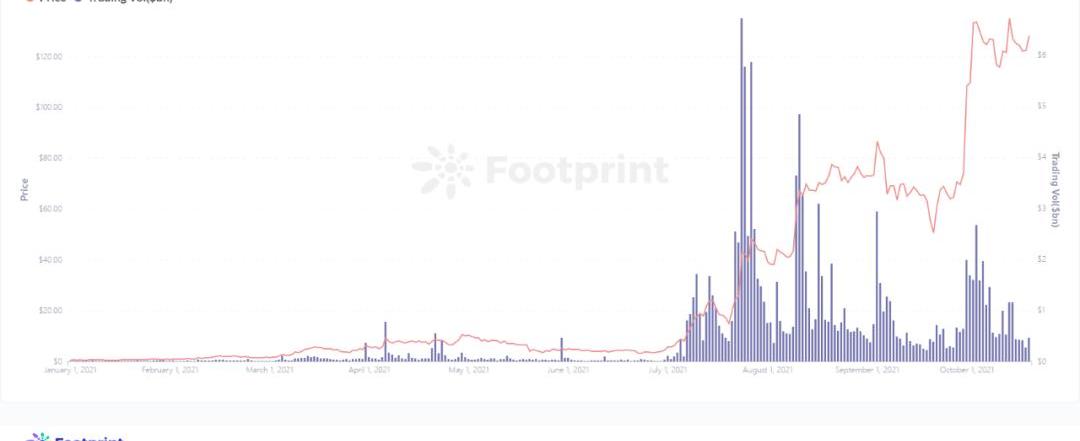 NFT的影響力也在不斷的擴大,NFT游戲通常是首先引人注意的,通過FootprintAnalytics的數據看到近期火爆的AxieInfinity在2021年6月開始不論從交易量還是價格都上升明顯。