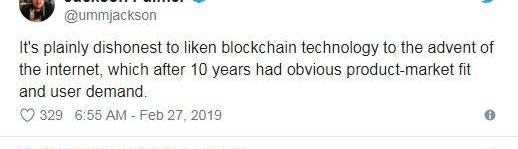 狗狗幣的創造者JacksonPalmer在周三發布的一條推特中表示,他不認為區塊鏈的發展與互聯網的發展有任何相似之處。