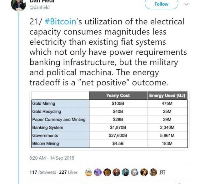上圖,加密貨幣資產管理平臺Interchange的聯合創始人DanHeld曾發推文表示:#比特幣使用的電容量消耗要比當前的法幣系統消耗的電量少幾個數量級。