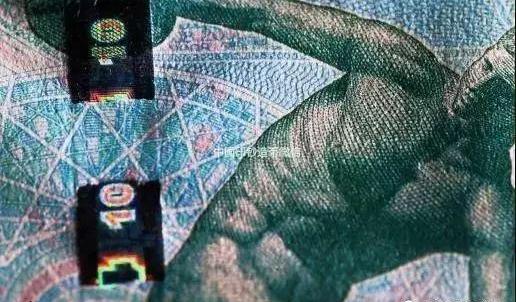 隨著觀察角度的改變,面額數字顏色在綠色和藍色之間交替變化,同時亮條呈現上下滾動效果。