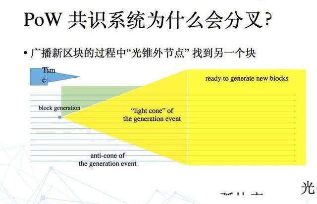 這個也不是的。我們用圖里邊每條線表示是一個節點,向右的這個箭頭表示的是時間。當這個節點產生一個區塊的時候,它需要把區塊廣播出去,但是廣播出去要消耗時間,所以會形成一個“事件光錐”。距離產生區塊的節點越遠,收到廣播過去的區塊所花的時間也越久,相應的要等到更晚的時間以后才能看到剛才生成的新區塊。也就是說只有在這個黃色區域及以后其他的節點才能看到你這邊產生的一個區塊。既然有光錐,相應的也就有光錐外的區域,也就是圖上綠色的部分。