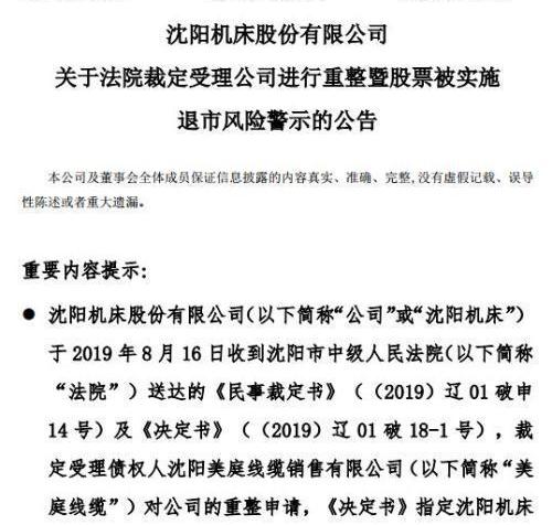 8月18日,沈陽機床發布公告,于2019年8月16日收到法院送達的《民事裁定書》,裁定受理債權人沈陽美庭線纜對公司的重整申請,《決定書》指定沈陽機床股份有限公司清算組擔任沈陽機床管理人。