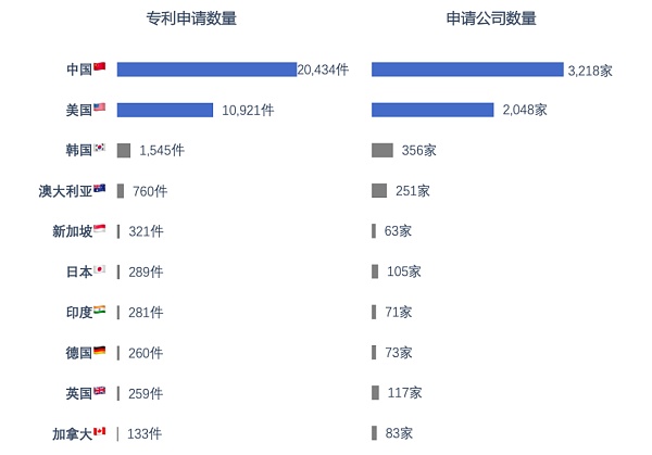 圖2:各國區塊鏈專利申請數量及申請公司數量(TOP10)