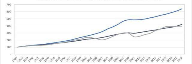 信貸體系的規模是GDP的好幾倍。由于信貸系統也比基礎貨幣供應量大幾個數量級,因此經濟活動在很大程度上由信貸的分配和擴展協調。然而,在過去的三十年中,信貸體系的增長遠遠超過了GDP的增長。下表列出了信用體系的變化率與GDP和聯邦稅收收入的變化率相比。在美聯儲的體系中,信貸擴張驅動GDP,最終決定了聯邦稅收的水平。