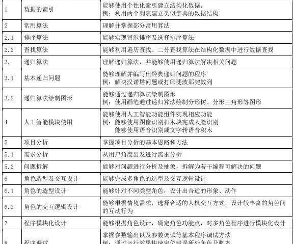 核心知識點能力要求青少年編程能力二級包括12個核心知識點,具體說明如下表所示: