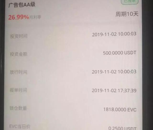 具體而言,投資者可以充值USDT購買EVC的“廣告包”。10天投資周期結束后,投資者可以獲得8%-15%的靜態收益。