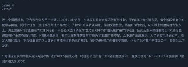牛頓交易所公告公告稱,“為確保忠實的牛頓玩家有足夠的NT”,牛頓交易所決定將用戶的資產強制轉換為平臺幣NT。此外,“為了維護廣大用戶利益與NT價值”,平臺決定將這些NT以每月10%的比例,分10月發放。