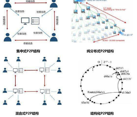 根據網絡中不同節點之間如何建立連接通道,P2P存在四種不同的模式,不同的區塊鏈應用可能采用不同的模式,具體分為:集中式、純分布式、混合式、結構化模式。