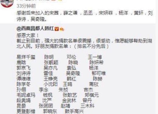1月26日,韓紅名下韓紅慈善基金會開啟募捐活動,超過103名文藝工作者和明星參與捐助,趙本山以“遼寧民間藝術團”的名義捐款1000萬元,郭德綱個人捐了一百萬,范冰冰捐了五十萬。