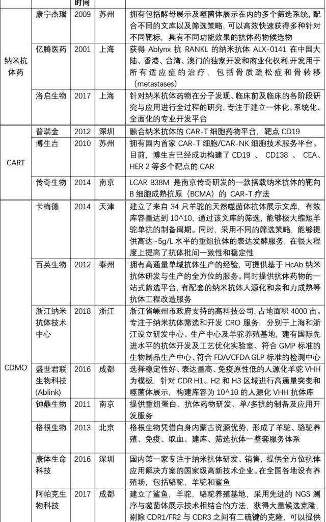 國內研究納米抗體的公司包括三種類型,一類是做納米抗體藥,代表企業包括蘇州康寧杰瑞,億騰醫藥。另外一類是用納米抗體做CAR-T細胞療法,包括南京傳奇、深圳普瑞金、博生吉等。第三類是CDMO公司,也是數量最多的,包括成都阿帕克、康體生命科技等。