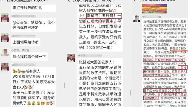 “在3月18日WXB幣以每枚2300元的價格開盤。開盤后必將成為全球第二大數字貨幣,每個“五行數字錢包”的資產達到上千萬元。”黃某還說,中國將發行的第六套人民幣,就是“云家人”夢寐以求的數字貨幣。“老大”號召“云家人”要積極參與到WXB區塊鏈數字貨幣中來,每個人最低持100枚WXB。三年后WXB將超過比特幣,漲到20多萬倍。